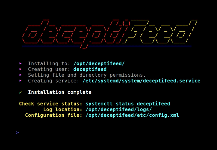 /opt/deceptifeed/to organize everything. - Registers Deceptifeed as a background service and configures it to start automatically at boot.